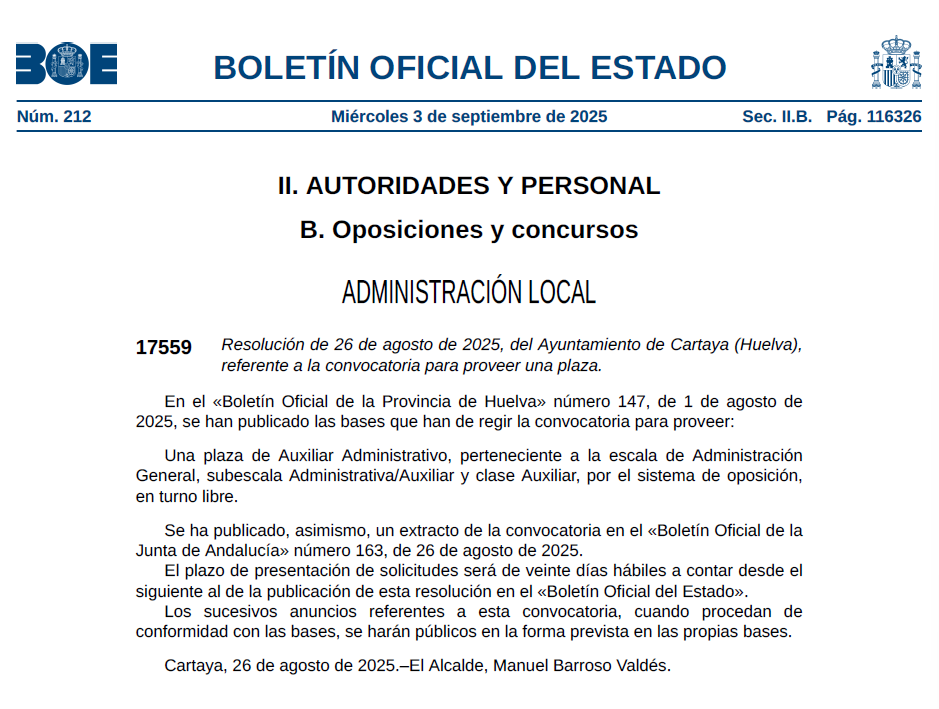 El Ayuntamiento de Cartaya (Huelva) ha publicado la apertura del plazo de solicitudes para cubrir 1 plaza de Auxiliar Administrativo/a. La convocatoria aparece en el BOE del 3 de septiembre de 2025.