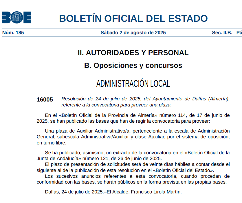 El Boletín Oficial del Estado del 2 de agosto de 2025 ha anunciado la apertura del plazo de solicitudes para una plaza de Auxiliar Administrativo/a en el Ayuntamiento de Dalías (Almería), a cubrir mediante el sistema de oposición en turno libre.