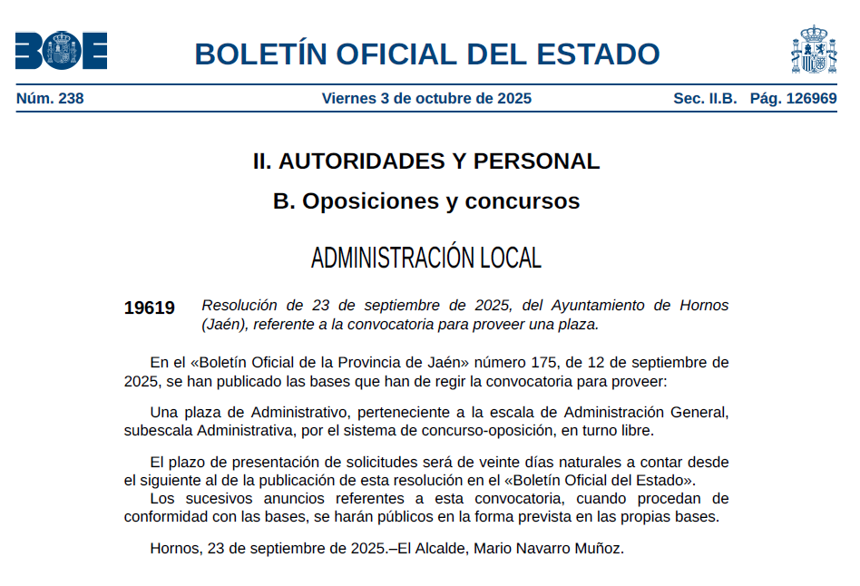 El Boletín Oficial del Estado ha publicado la convocatoria para cubrir 1 plaza de Administrativo/a en el Ayuntamiento de Hornos de Segura (Jaén).